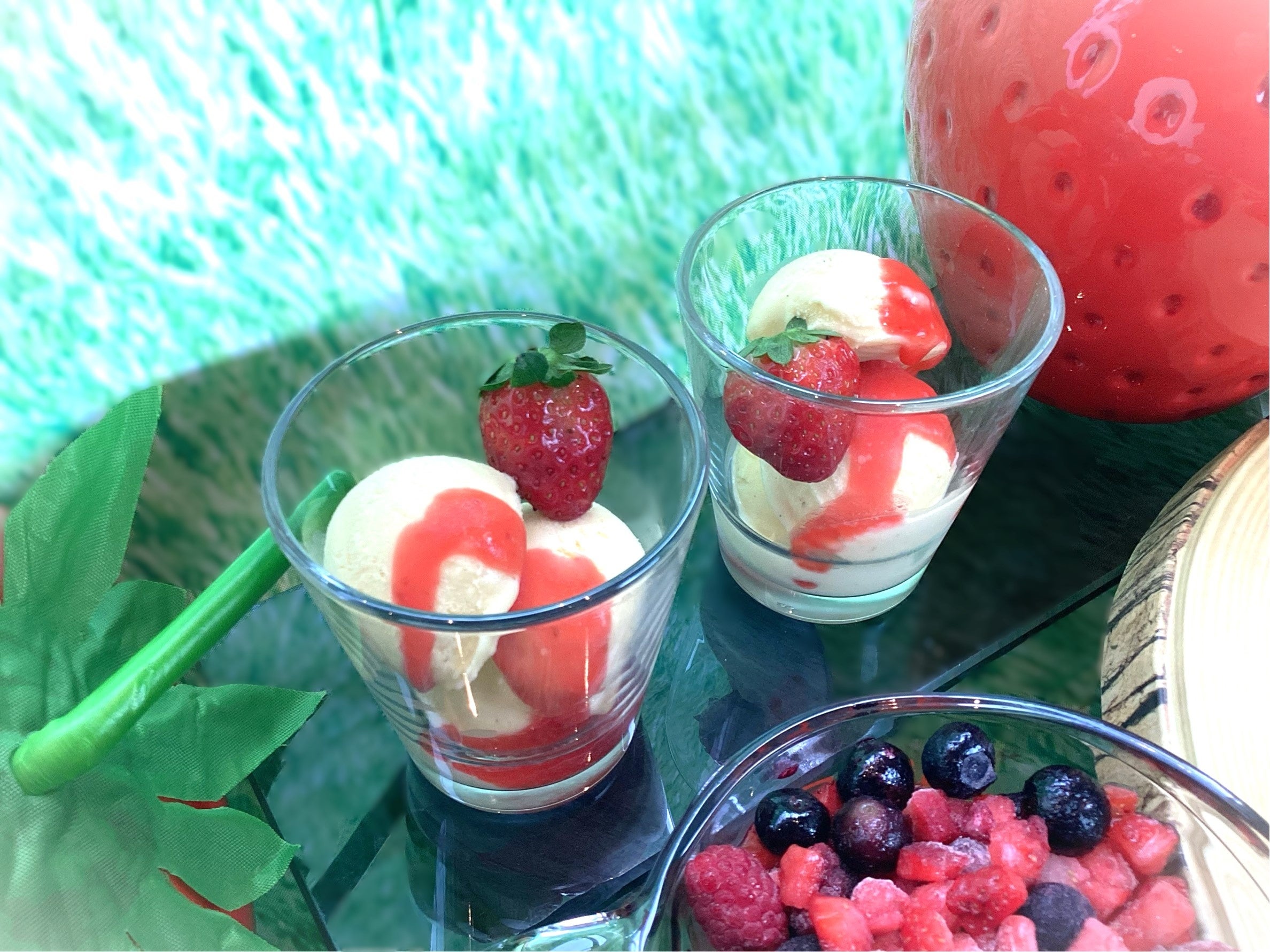 もちろんフレッシュいちごだけでなく、いちご&杏仁のスムージー、ひと口サイズのいちごケーキ、いちごソースやダイスいちご&ベリーなどお好みでアイスやパンケーキ、クロッフルなどにトッピング!