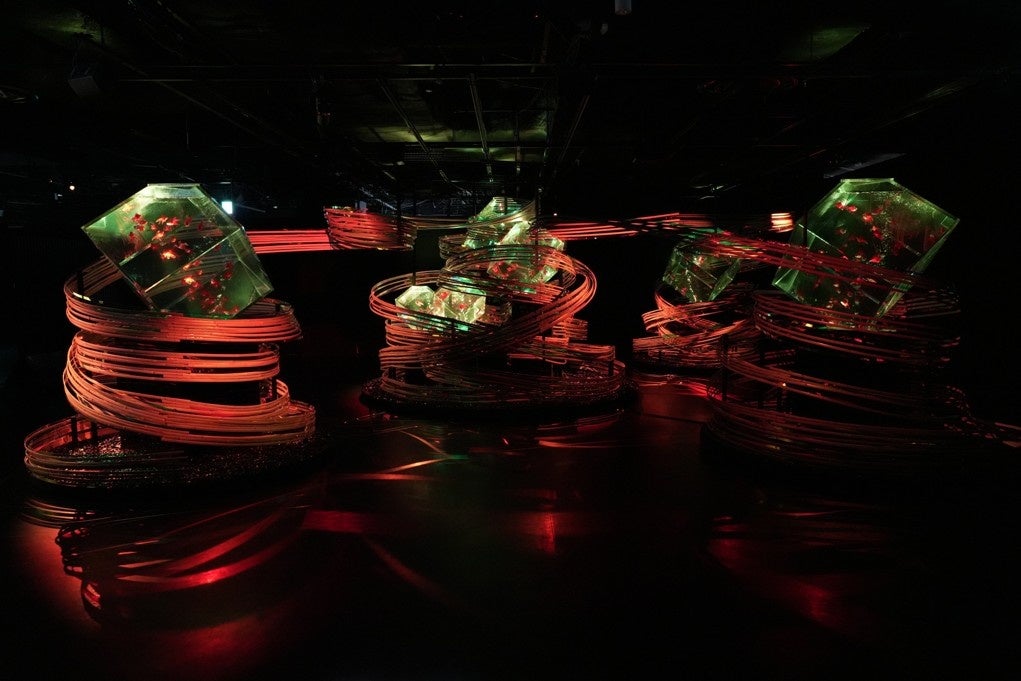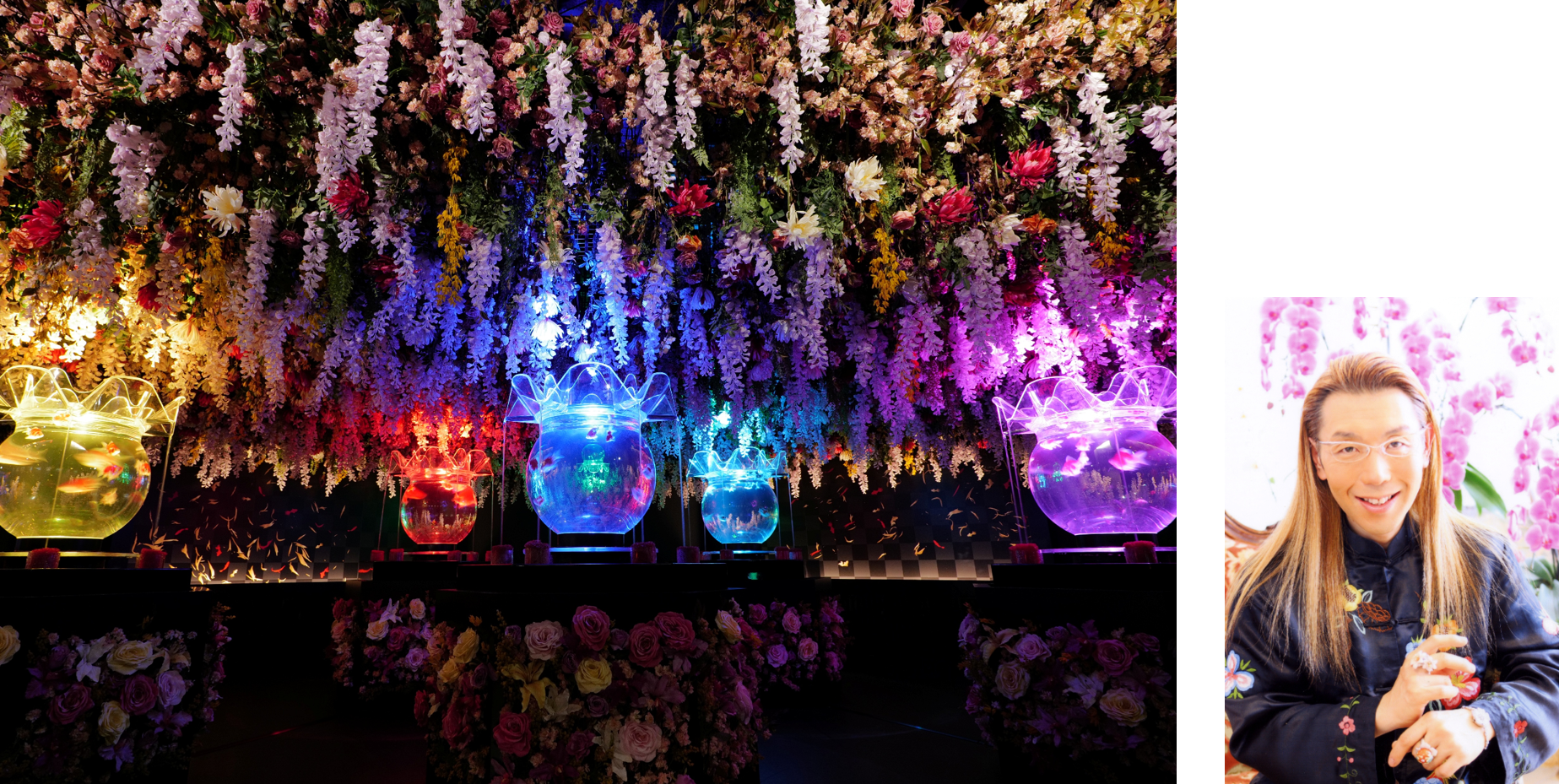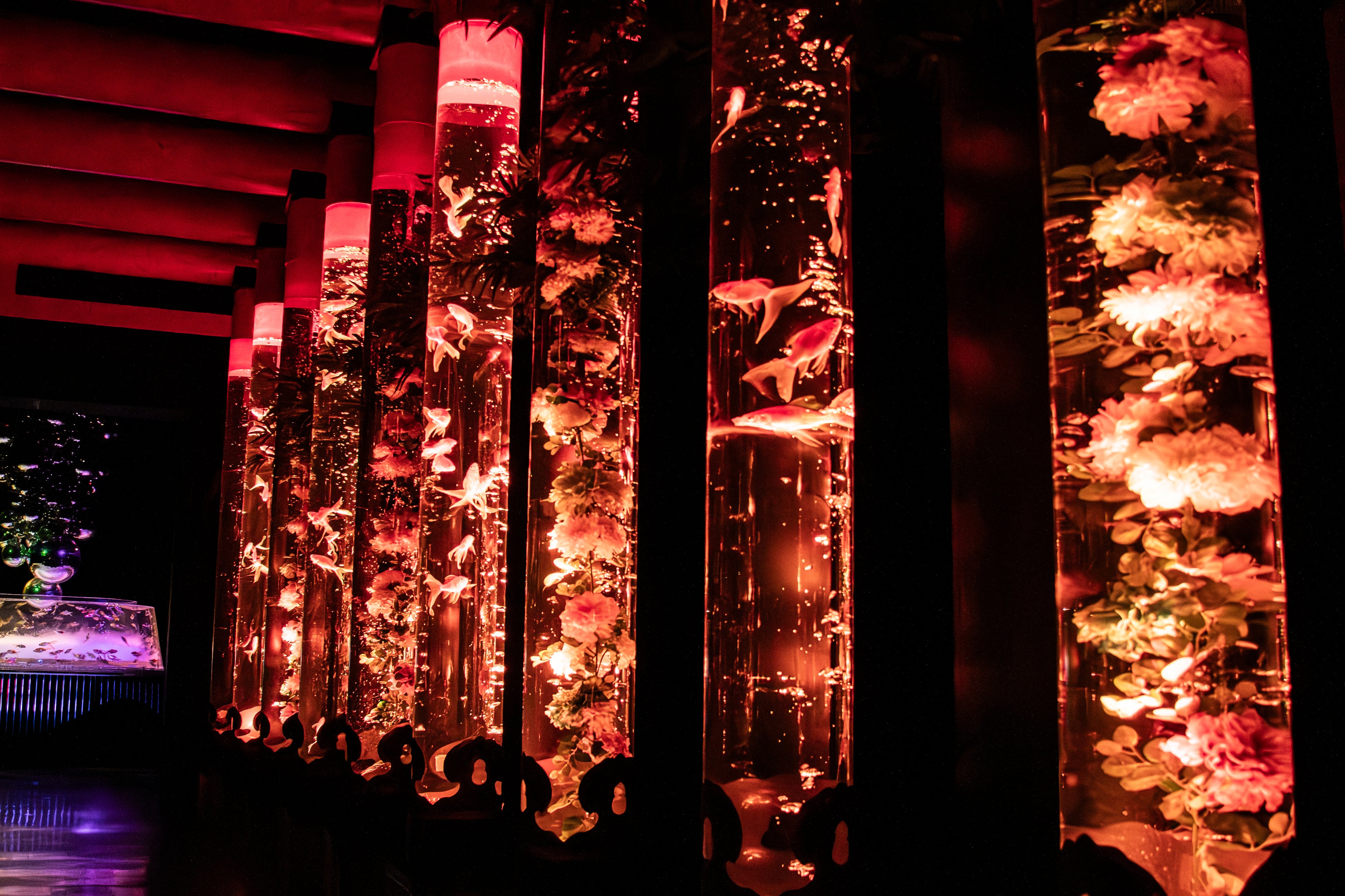 假屋崎氏:「水槽作品「花魁」が持つ、きらびやかな世界観は「華」の精神に通じるものがあります。この空間とコラボレーションするにあたり大切にしたのは、「金魚の命の躍動」と「花の生命の輝き」を融合させることでした。金魚が泳ぐ水の世界と、花が咲き誇る世界が混じり合い、この世のものとは思えない幸福感に包まれるような空間を創作しました。」