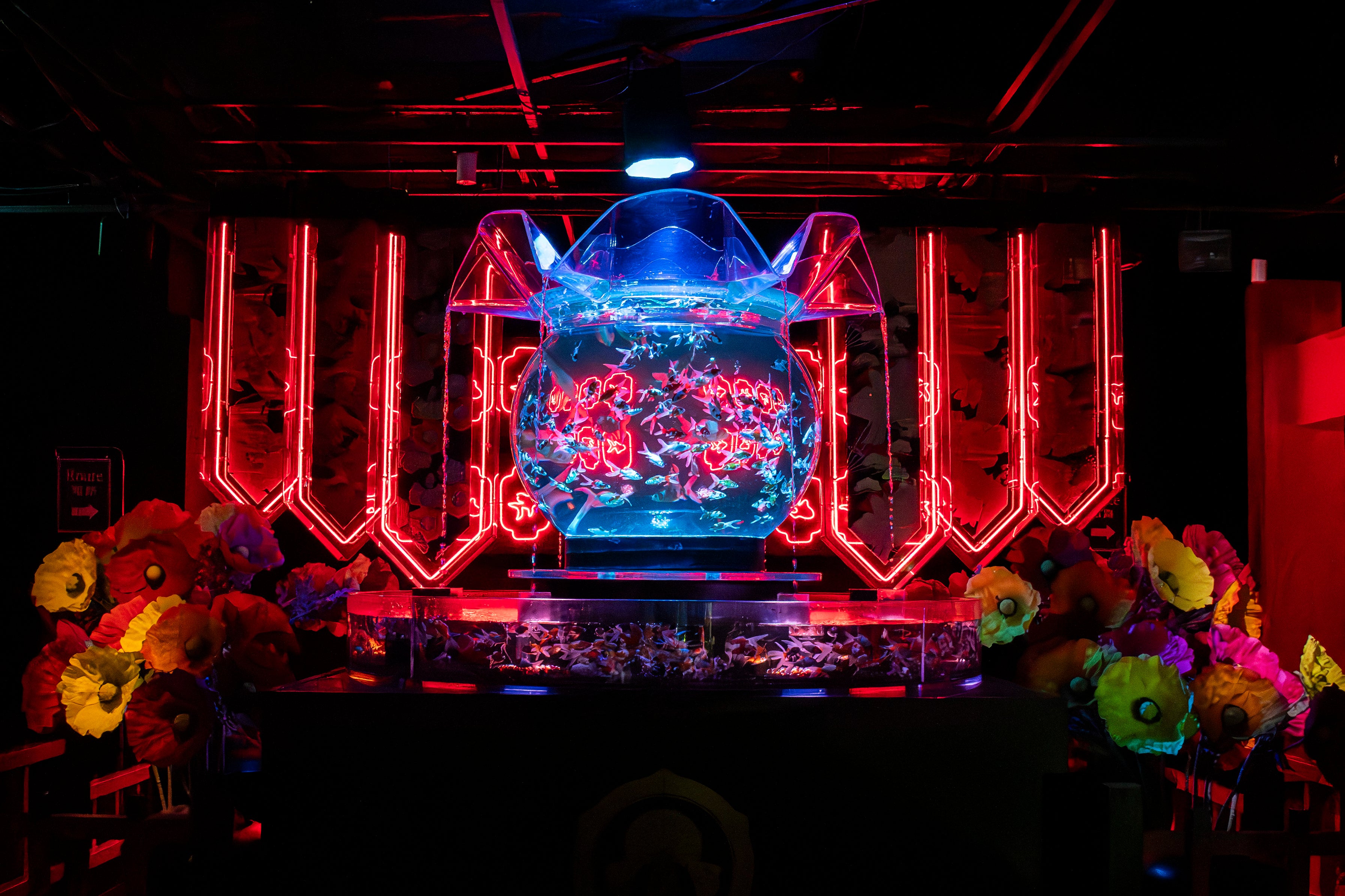 水槽作品“花魁”が並ぶ空間を様々な花で埋め尽くした華やかな空間作品。金魚×花の優美で華やかな空間が広がります。花に囲まれる、没入空間をお楽しみください。