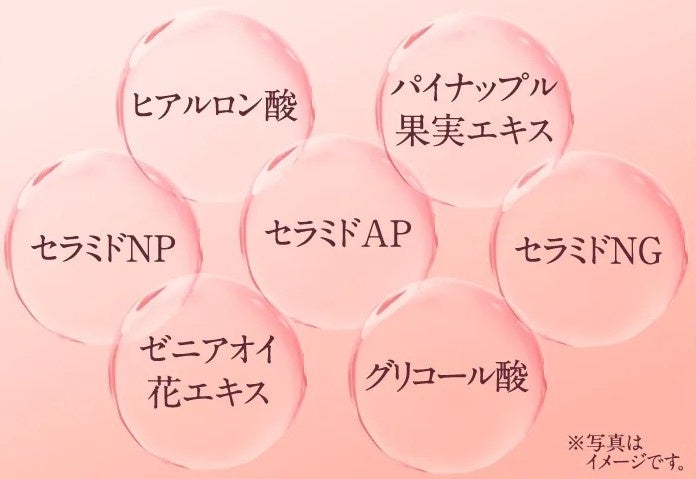 保湿力と角質層への浸透力に優れた美容成分を厳選。水分保持力を高めるヒアルロン酸やセラミドNP・セラミドAP・セラミドNG、肌荒れを防ぎ透明感をサポートするパイナップル果実エキスやゼニアオイ花エキス、角層を柔らかくするグリコール酸を配合しています。