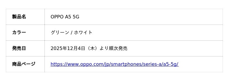 「OPPO A5 5G」が12月4日(木)から販売開始
