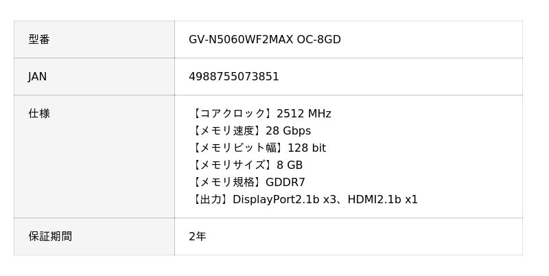 シー・エフ・デー販売株式会社(社長:三谷弘次、本社:愛知県名古屋市)が代理店を務めますGIGABYTEブランドの新製品として、NVIDIA GeForce RTX 5060 デュアルファン搭載グラフィックボード『GV-N5060WF2MAX OC-8GD』を発売いたします。