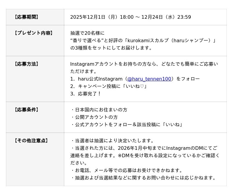 年末の気配が近づく12月、ヘッドビューティブランド「haru」(株式会社nijito/本社:東京都港区、EC事業部:福岡市中央区)では、12月1日(月)より一年の感謝を込めて、クリスマスシーズンを彩るプレゼントキャンペーンを公式Instagramで開催いたします。公式アカウント(@haru_tennen100)をフォロー&いいねをいただいた方から、抽選で20名様に『kurokamiスカルプ』の3種セットをお届けいたします。
