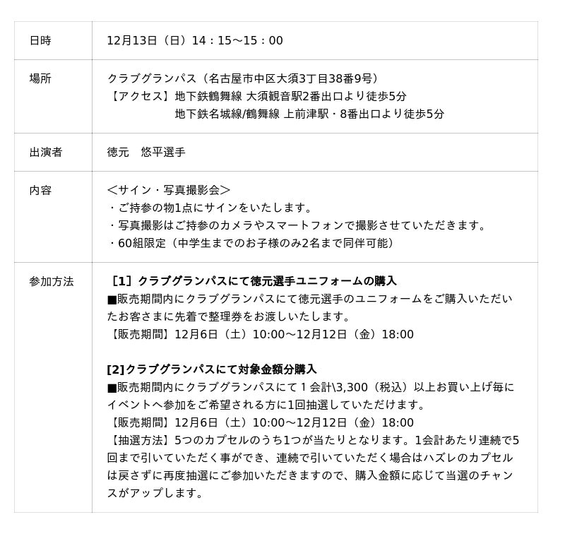 またイベント終了後にはクラブグランパスでも徳元選手の来店イベントを実施いたします。