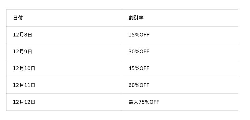 本キャンペーンは、毎日15%ずつ値引き率がアップする“逆オークション形式”。割引率は以下の通り、日にちが進むほどお得になります。