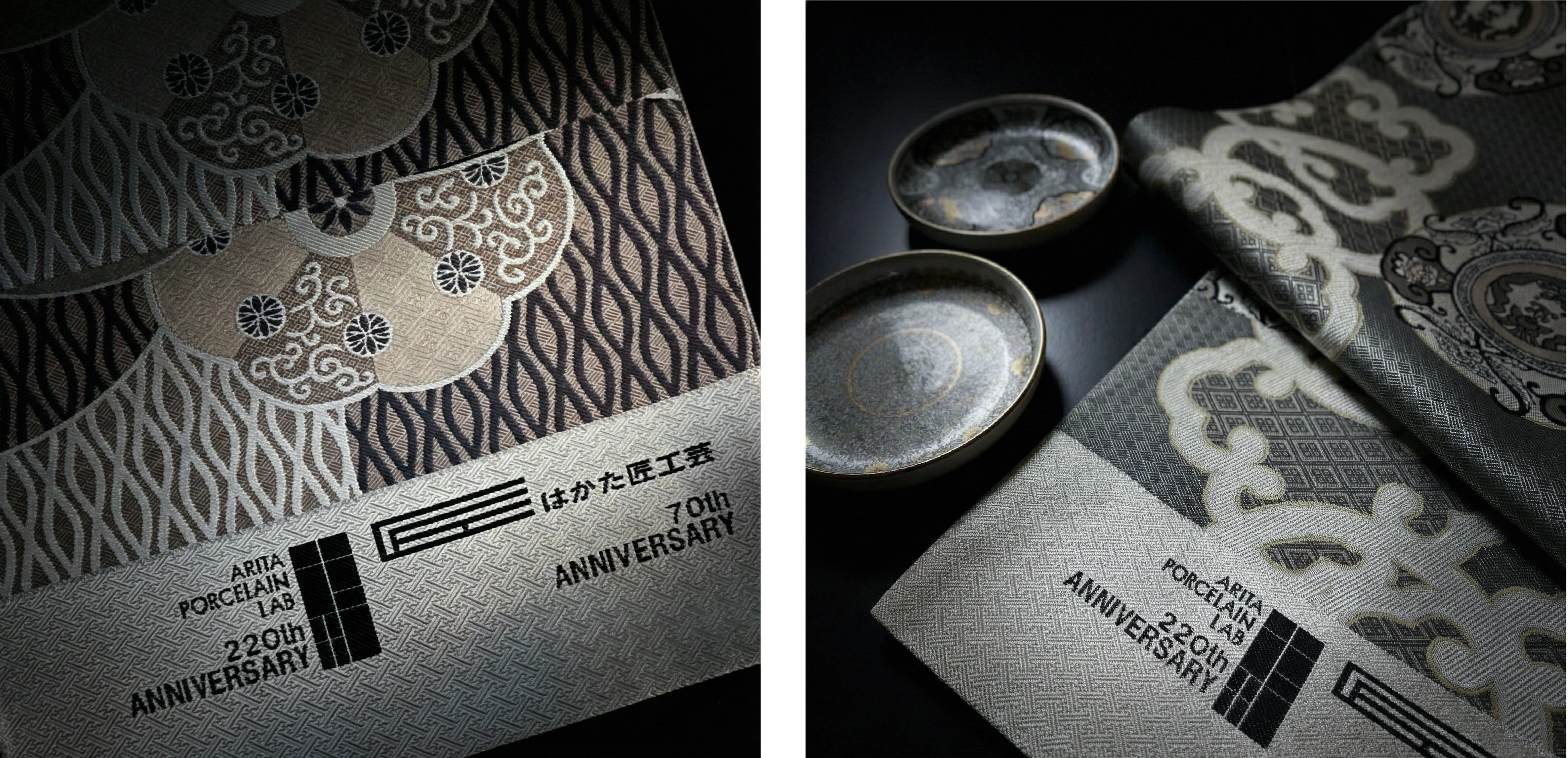 本企画は、2025年に創業220年を迎えるアリタポーセリンラボと、設立70年を迎えるはかた匠工芸が、互いの節目を祝う記念事業として実現。有田焼の洗練された意匠を、博多織・佐賀錦の伝統技法で表現した、至高のシリーズです。