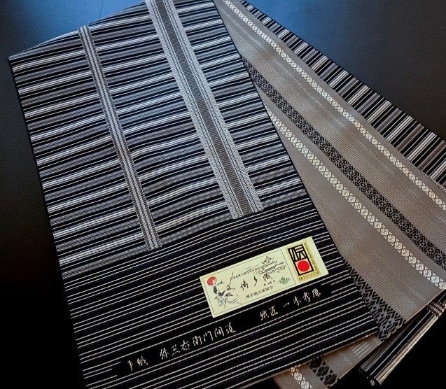 博多織求評会受賞作品「弥三右衛門間道II」 献上柄のルーツとされる満田弥三右衛門にちなんだ代表柄。経糸(たていと)で柄を出す手織りならではのしなやかな風合いで、凛とした雰囲気に織り上げました。