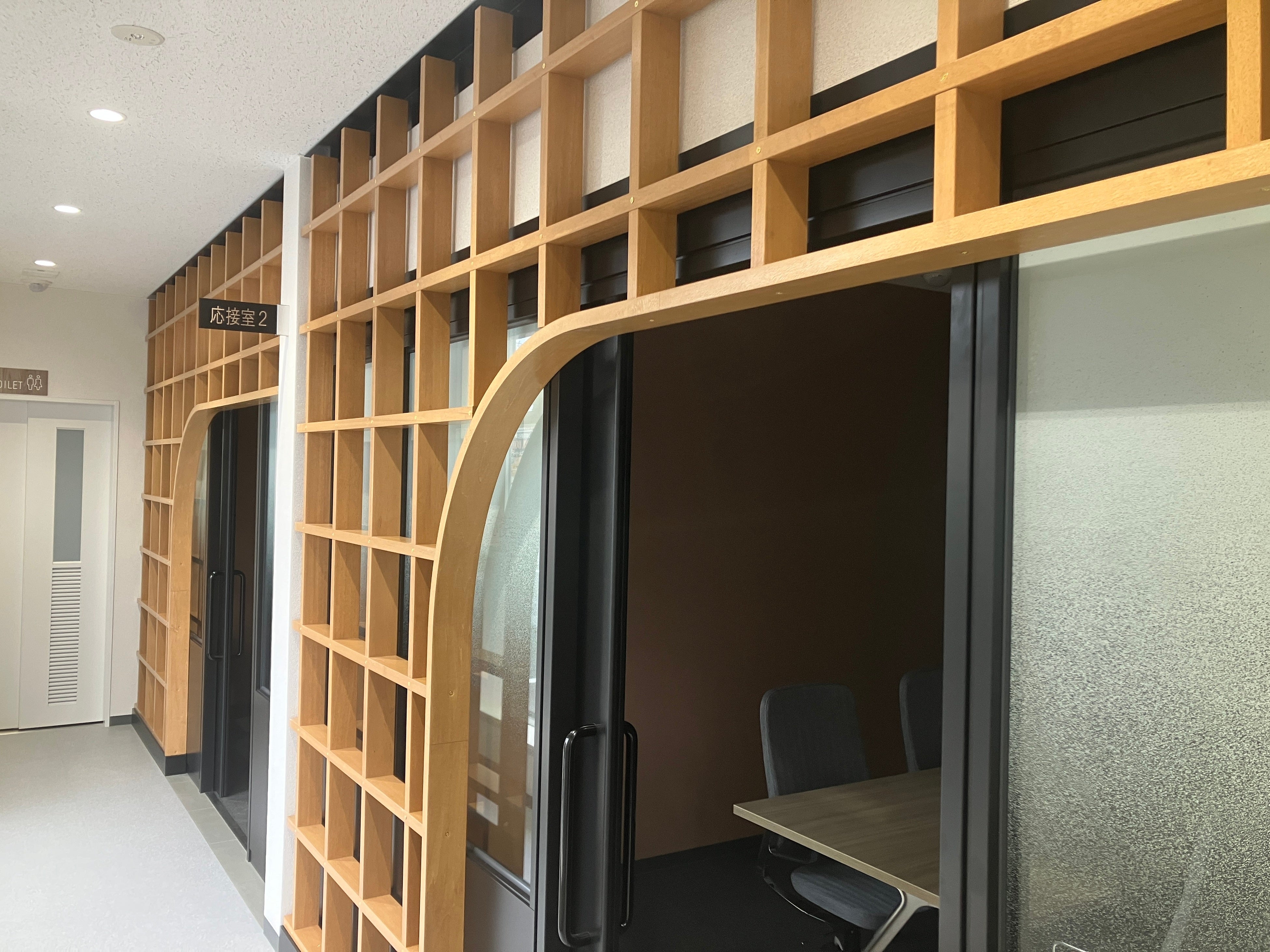 県内では江戸時代から養蚕業が盛んで、蚕に繭作りを促すために使用する格子状の枠「蔟(まぶし)」をモチーフとした装飾を、ローカウンターブースと応接室の入口壁に施しました。
