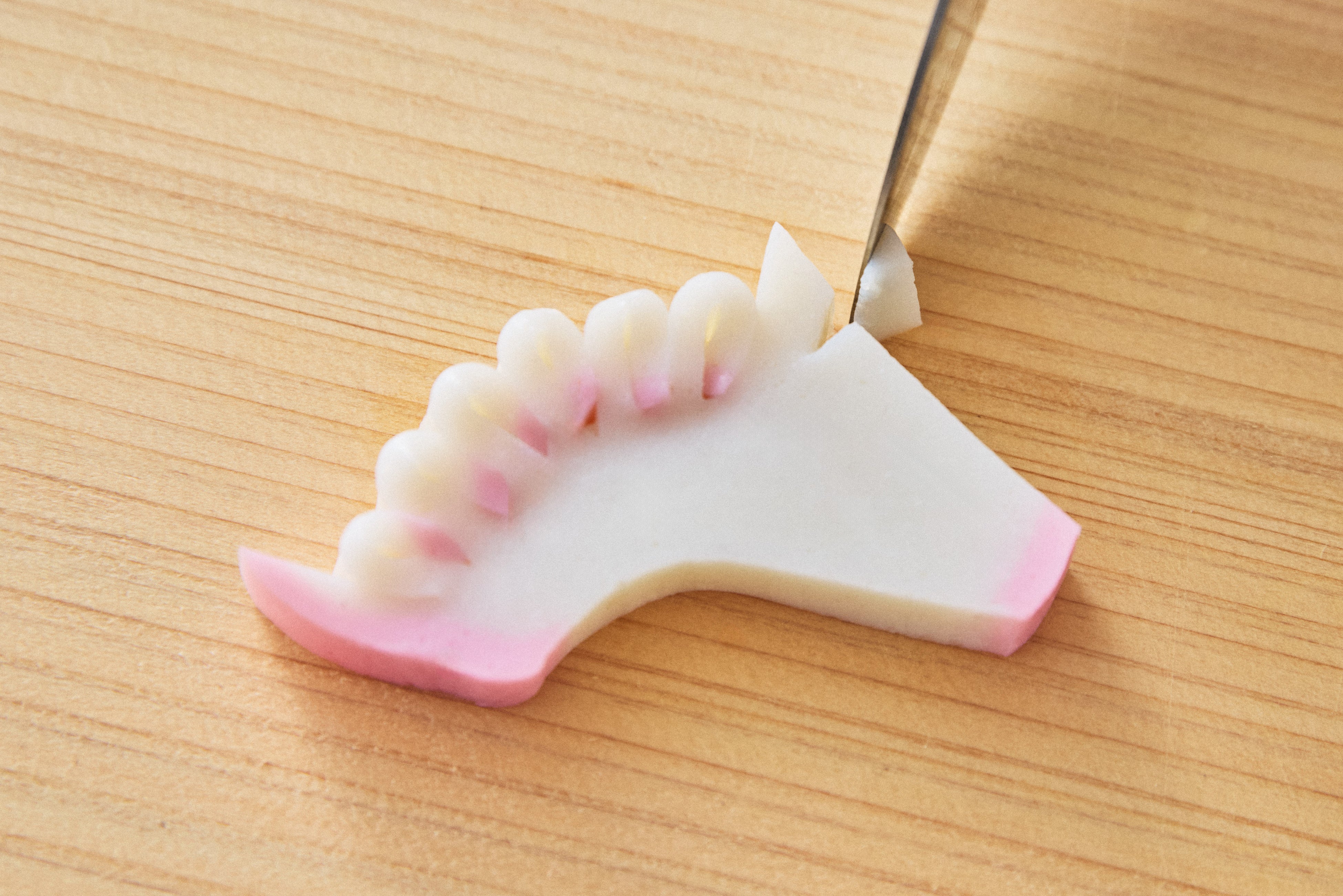 1.かまぼこを12mmの厚さに切り、3mm幅の切り込みを7カ所入れる。