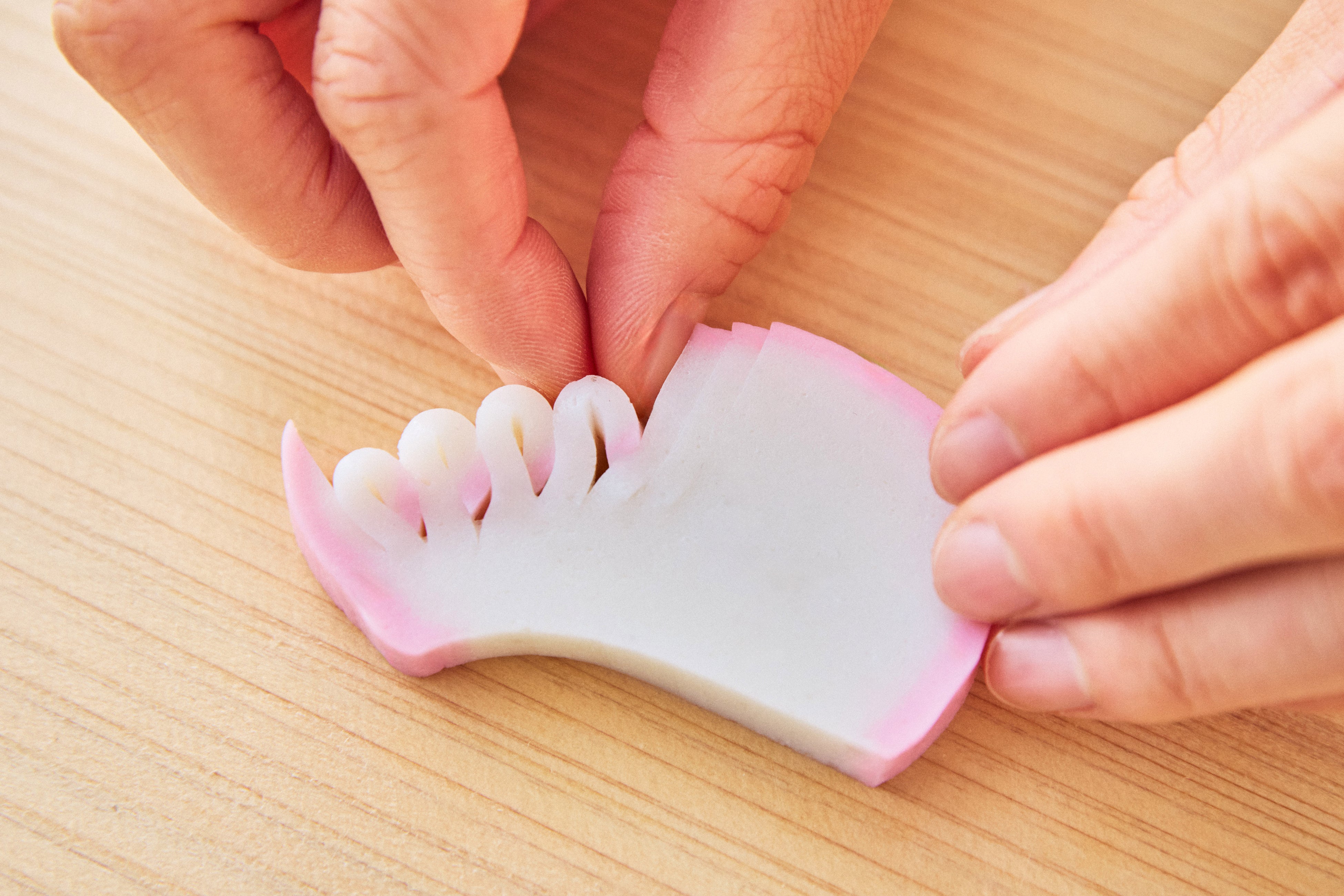 今年考案した午の飾り切りは、かまぼこ1切れのみで仕上がるように設計しております。切り込みにかまぼこを差し込むことで、午の特徴である"たてがみ"を表現しました。見た目の印象に反して工程は複雑ではなく、飾り切りが初めての方でも、気軽に挑戦していただけます。