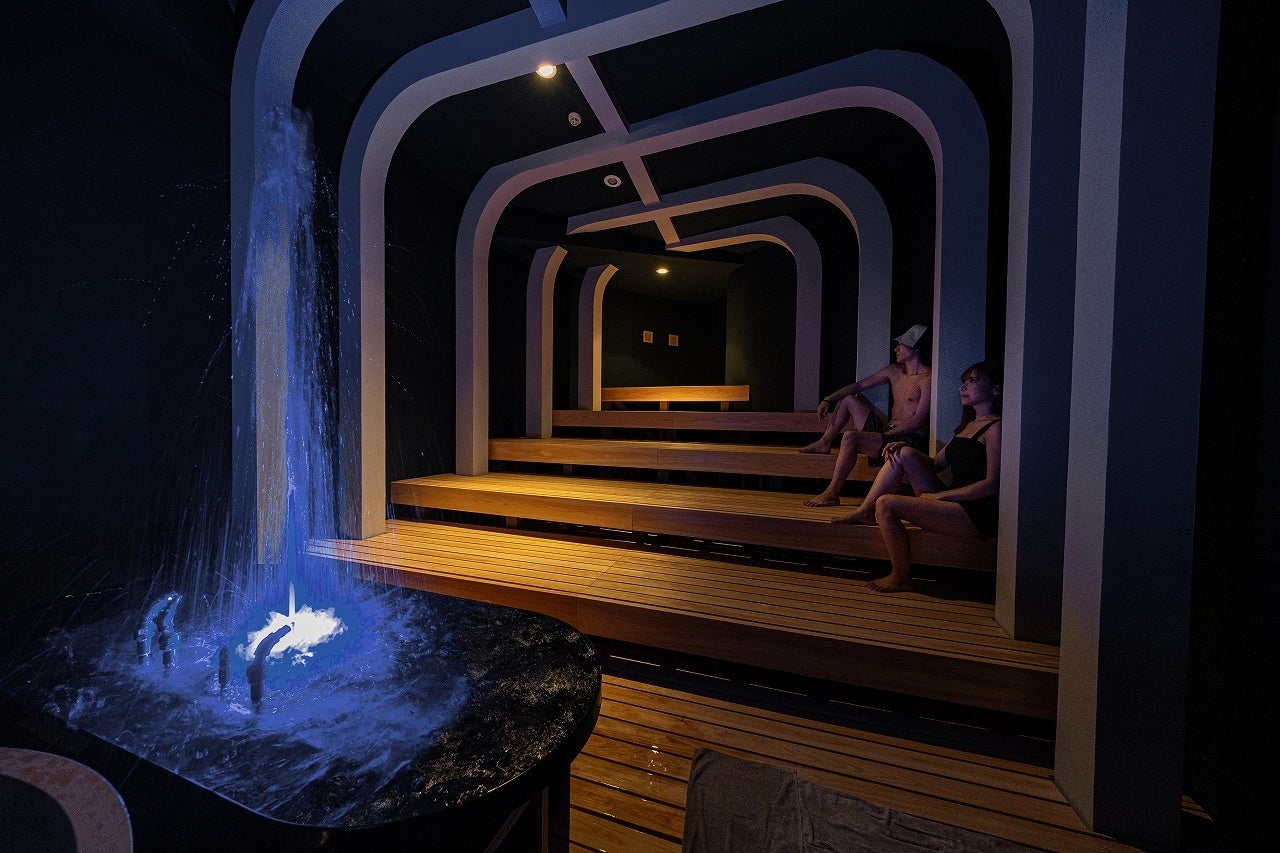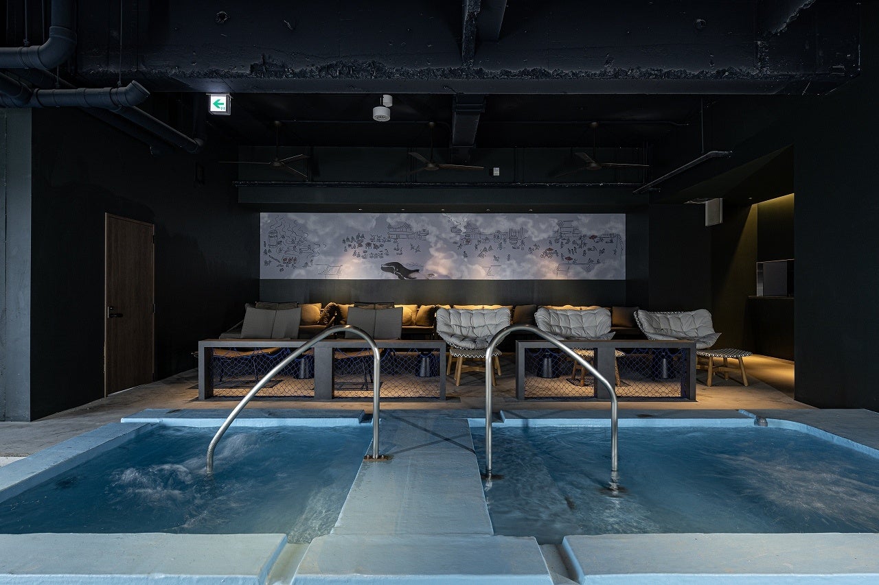 イケス水風呂は、実際のイカ生簀を活用。荒波と凪をイメージした2種類の水流・温度が行き来し、“海に漂う整い”を楽しめます。シングル水風呂(10℃以下)と25℃前後の水風呂による冷々交代浴も可能です。