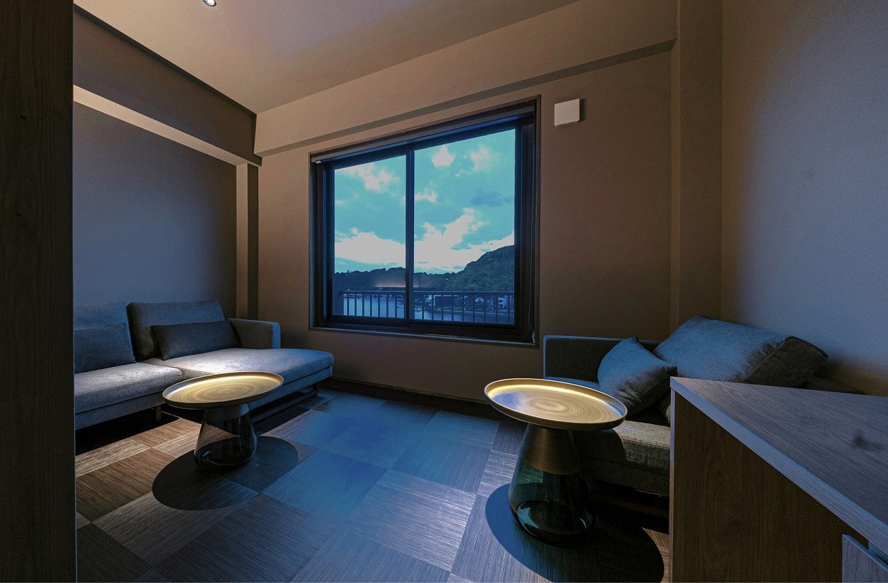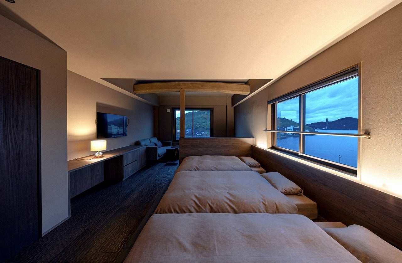 JIN6サウナの上階に位置する中尾甚六HOTELは、全室オーシャンビュー。朝夕に移ろう潮の色や漁船の往来など、町の息づかいそのものが滞在の記憶を彩ります。
