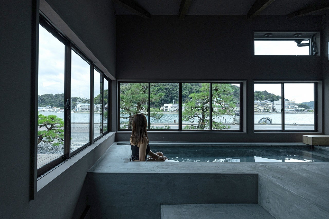 イカサウナは、柔らかな曲線が印象的なデザインと、港町を一望できる大窓が特徴です。