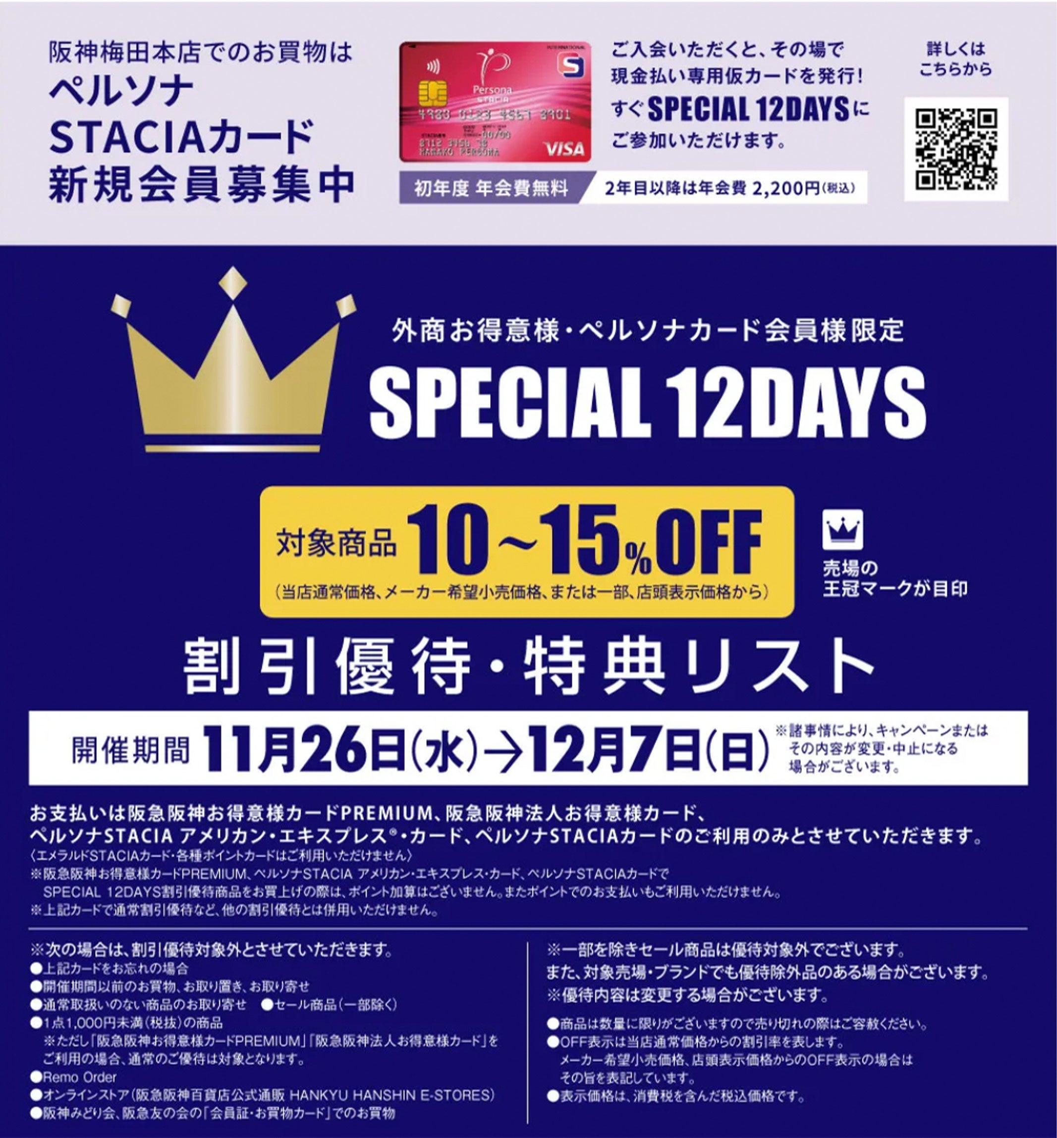 ■【12月7日(日)まで】阪神梅田本店 SPECIAL DAYS 優待のご案内阪神梅田本店では、ペルソナカード・お得意様カード会員様向けの「SPECIAL DAYS」を実施しております。パーセル ジュエリー梅田店でも、対象ジュエリーを15%OFFにてお求めいただけます。当日のご入会でもご参加いただけますのでぜひご利用ください。