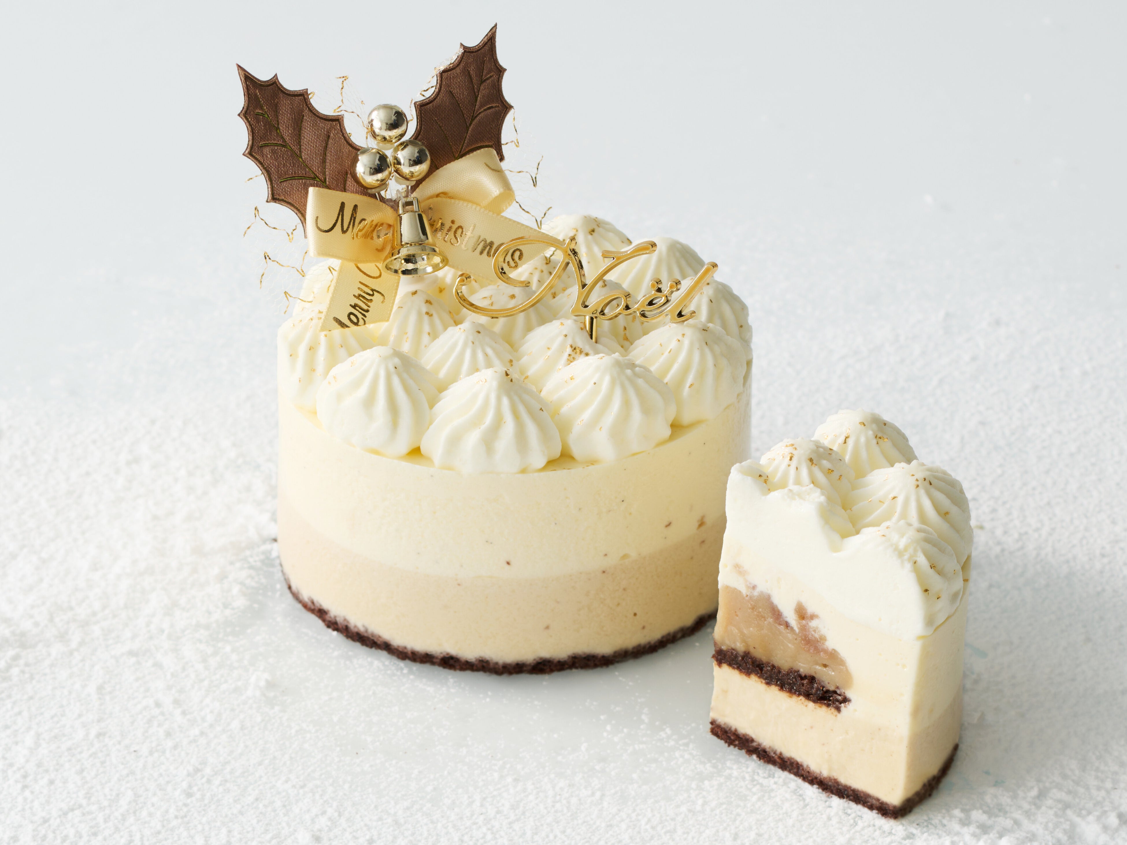 ムース層には、イタリア栗と和栗の 2 種を使用したなめらかなマロンムースをベースとし、その上にラム酒の風味豊かなバニララムムースを重ねました。層の間には、ラム酒の上品な香りをまとわせた和栗のマロンクリームを絞り込み、さらに奥深い風味と食感を楽しめるイタリア栗のダイスを忍ばせることで、2 種類の栗の贅沢なハーモニーを生み出しています。土台のショコラスポンジにはコーヒーを染み込ませました。天面には北海道産生クリームを絞り、華やかなクリスマスを演出します。【商品名】イヴォワール