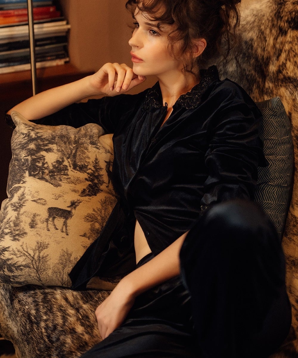 贅沢な質感のランジェリーは冬のインナーとしてもおすすめ。艶やかなベルベット素材とフローラルレースの組み合わせがラウンジウェアとしても美しい一枚。特別な夜のために。