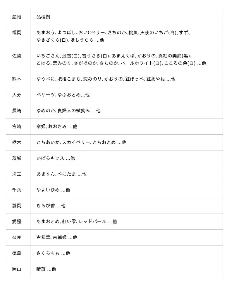 上段左から順に、・ゆめのか・古都華・貴婦人の微笑み・天使のいちご(白)・あまおう・さちのか・ベリーツ・恋みのり・淡雪(白)・古都姫・パールホワイト(白)・紅ほっぺ