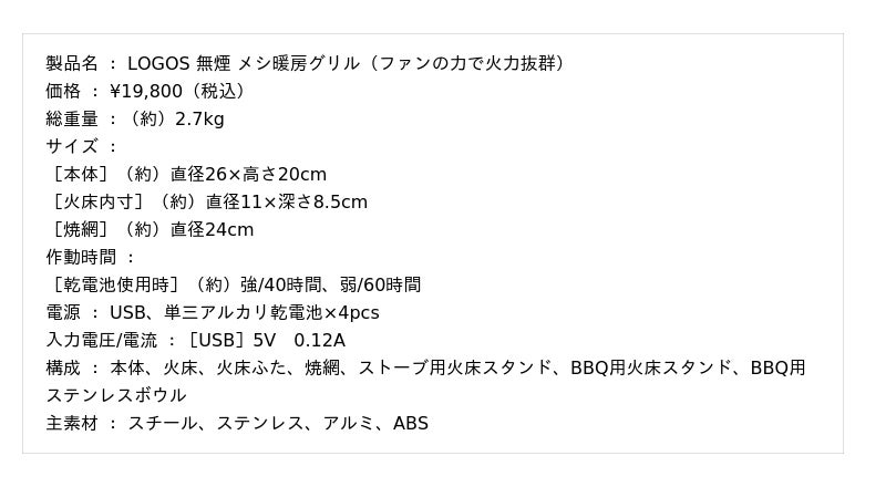 【 LOGOS 無煙 メシ暖房グリル(ファンの力で火力抜群)】https://www.logos.ne.jp/products/info/11640