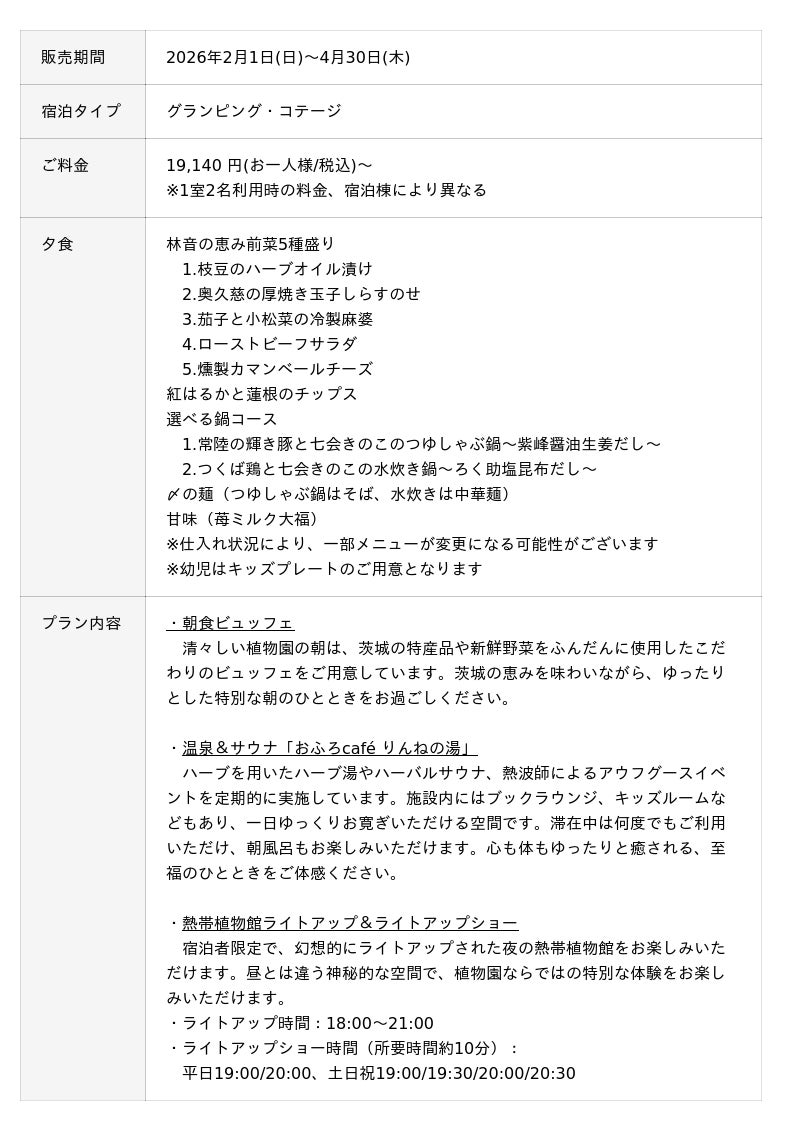日本初の“泊まれる植物園”※「THE BOTANICAL RESORT 林音(ザ ボタニカルリゾート リンネ)、以下:林音(リンネ)」は、2026年2月1日(日)~4月30日(木)限定で、茨城のブランド豚「常陸の輝き」・ブランド鶏「つくば鶏」と、地元農園七会(ななかい)きのこセンターのきのこをふんだんに使用した、つゆしゃぶor水炊き鍋が選べる贅沢鍋フルコースプランの予約を開始いたしました。本プランは宿泊するコテージやグランピングに備わる暖房完備のプライベートデッキで、鍋をはじめとするフルコースを楽しめるプランです。