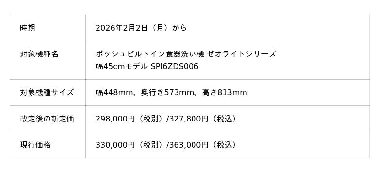 ドイツのBSHホームアプライアンス社ブランド家電の輸入代理を行う株式会社G-Place(本社:京都府長岡京市、代表取締役社長:綾部英寿)は、同社が輸入販売しているボッシュビルトイン食器洗い機の価格改定を行います。対象機器は、ゼオライトシリーズ幅45cmモデルのSPI6ZDS006で、現行価格から約10%の値下げとなります。