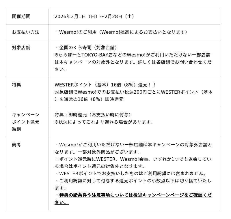 WESTERポイント16倍還元!「くら寿司をご贔屓に!! ウェスモバリューフェア」を2月1日(日)から開催します