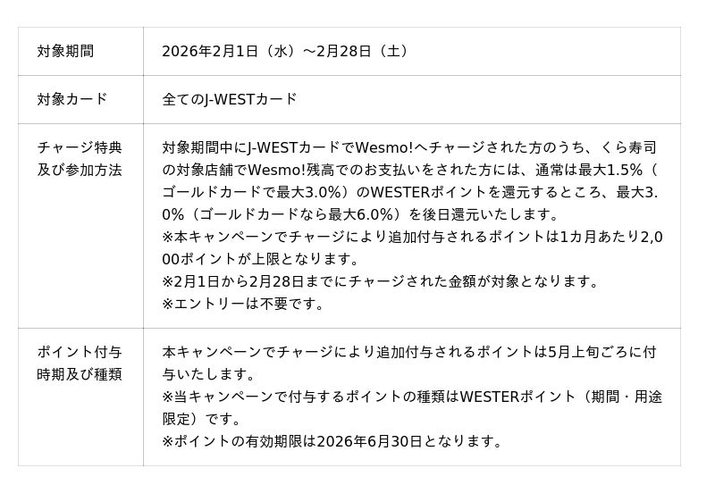 西日本旅客鉄道株式会社(本社:大阪府大阪市、代表取締役社長:倉坂昇治)と株式会社ジェーシービー(本社:東京都港区、代表取締役会長兼執行役員社長:二重孝好、以下「JCB」)は、JR西日本のスマホ決済アプリ『Wesmo!』のキャンペーンとしまして、Wesmo!のご利用でWESTERポイント(基本)が通常の16倍(8%)即時還元とおトクになる「くら寿司をご贔屓に!! ウェスモバリューフェア」を2026年2月1日(日)~2月28日(土)まで開催します。