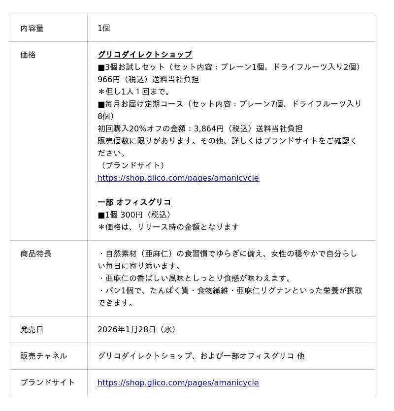 江崎グリコ株式会社は、新ブランド「亜麻仁サイクル」を2026年1月28日(水)に立ち上げ、「亜麻仁サイクル フェムサポートパン<プレーン>」、「亜麻仁サイクル フェムサポートパン<ドライフルーツ入り>」を、グリコダイレクトショップおよび一部オフィスグリコにて、期間限定で発売します。ブランド名にもなっている「亜麻仁」を配合したパンで、女性の穏やかで自分らしい日々に寄り添います。