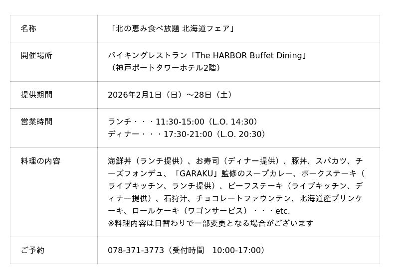 株式会社アベストコーポレーション(代表取締役:松山 みさお)が運営する神戸ポートタワーホテル(支配人:薩摩 利幸、兵庫県神戸市中央区)は、バイキングレストラン「The HARBOR Buffet Dining(ザ・ハーバー ビュッフェダイニング)」にて、2026年2月1日(日)から28日(土)まで、「北の恵み食べ放題 北海道フェア」を開催いたします。