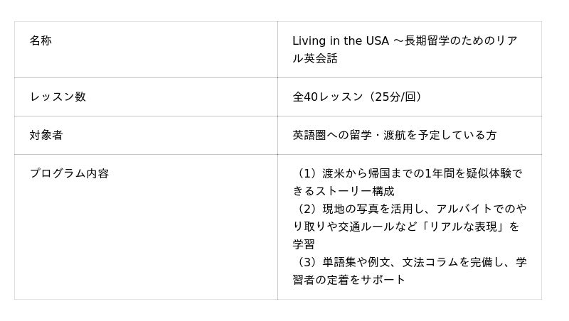 産経ヒューマンラーニング株式会社(本社:東京都新宿区、代表取締役:中谷友紀、以下「当社」)は、長期留学や海外渡航を控える方を対象に、現地でのスムーズな生活を支援するオンライン英会話教材『Living in the USA ~長期留学のためのリアル英会話』の提供を開始いたします。本テキストは、入国審査から大学生活、さらには現地でのトラブル対応まで、1年間のアメリカ生活をストーリー形式で体験しながら、知識としての英語ではなく、無意識に「使う」ための「生活英語」を習得することを目指した実践的プログラムです。