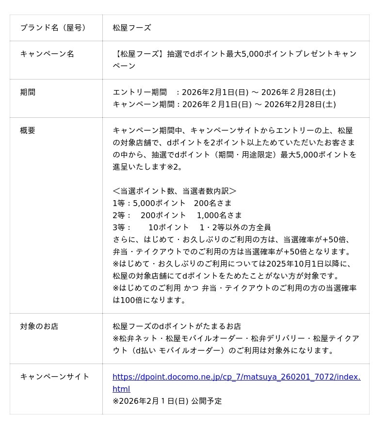 株式会社NTTドコモ(以下、ドコモ)は、松屋フーズにおいて「抽選でdポイント最大5,000ポイントプレゼントキャンペーン(以下、本キャンペーン)」を2026年2月1日(日)から2026年2月28日(土)までの期間で開催いたします。