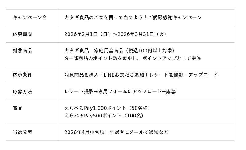 【ご好評につき第2弾!えらべるPayが当たる】カタギ食品、レシート応募キャンペーンを再び開催