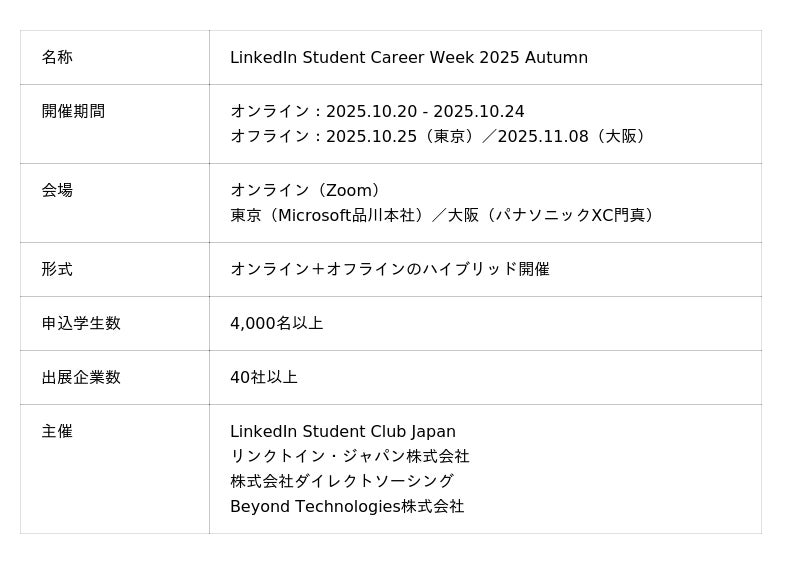 合同会社OneRiseは、リンクトイン・ジャパン株式会社および、株式会社ダイレクトソーシング、Beyond Technologies株式会社が主催する学生向けキャリアイベント「LinkedIn Student Career Week 2025 Autumn」(以下、LSCW)の趣旨に賛同し、東京、関西で開催されたイベントに協力しました。