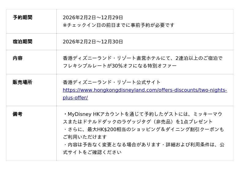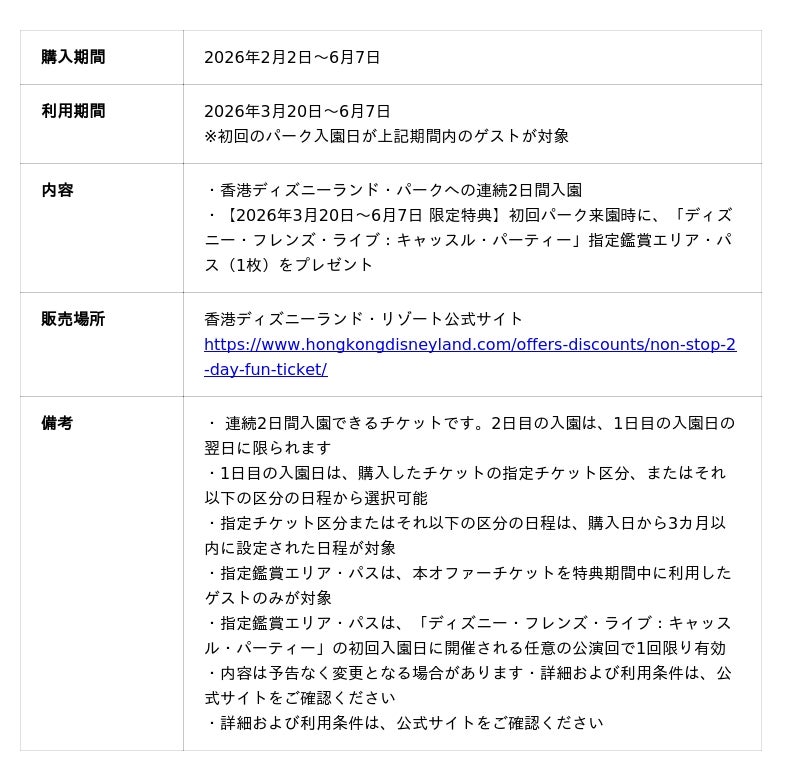また、2026年6月7日までの期間中、「ノンストップ・2デー・ファン・チケット」を利用すれば、2日目のパーク入園をHK$100で楽しめます。さらに、「ダッフィー&フレンズ プレイ・デイズ」期間中に本チケットを利用したゲストには、初回のパーク来園時に「ディズニー・フレンズ・ライブ:キャッスル・パーティー」の指定鑑賞エリア・パスを1枚プレゼントします。