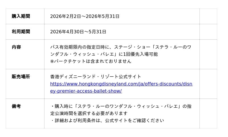 また、ファンに人気のステージ・ショー「ステラ・ルーのワンダフル・ウィッシュ・バレエ」を2026年4月30日(木)から5月31日(日)の期間限定で再演します。ディズニー・ストーリーブック・シアターを舞台に、ステラ・ルーが再び主役となり、約30分間の感動的なパフォーマンスで“夢を追いかける大切さ”を伝えます。「ディズニー・プレミア・アクセス:ステラ・ルーのワンダフル・ウィッシュ・バレエ」を利用すれば、ステラ・ルーの夢が輝く瞬間を、より近く、より特別な席でお楽しみいただけます。