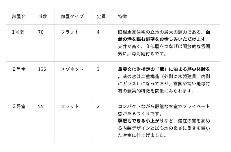 「泊まれる文化財」として再生するにあたり、建物の真正性を維持するため文化財指定箇所への物理的な改変を行わず、3つの客室へと改修しています。なお、ホテル開業後も建造物のうち母屋部分の一般公開を継続し、公共的な文化遺産としての役割も担います。