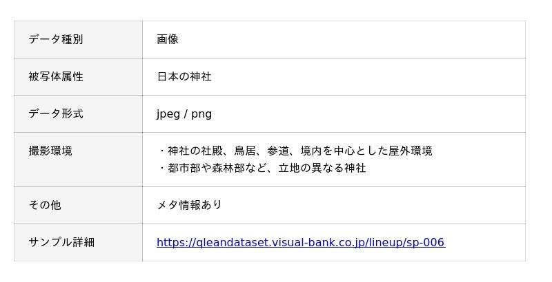 Visual Bank株式会社(東京都港区、代表取締役CEO 永井真之)は、傘下の株式会社アマナイメージズを通じて展開するAI学習用データソリューション「Qlean Dataset(キュリンデータセット)」において、画像認識、画像分類、マルチモーダルAIなどのAI開発・研究用途に向けた「日本の神社の画像データセット」の提供を開始しました。