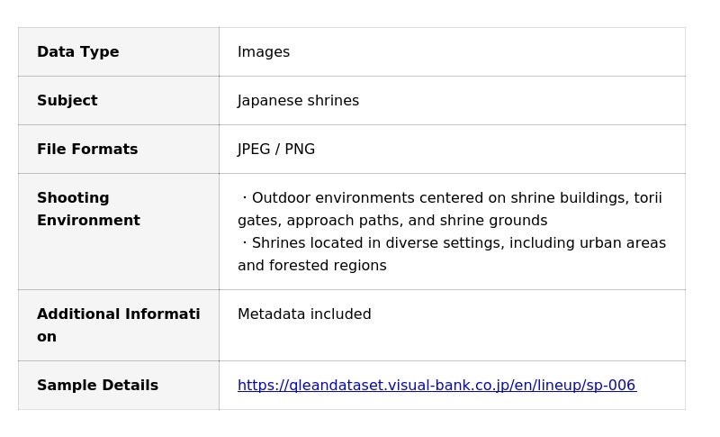 The Japanese Shrine Image Dataset is part of Qlean Dataset’s original lineup, AI Data Recipe, and is cleared for both research and commercial AI use. Through datasets grounded in cultural and social contexts, Visual Bank supports practical development and evaluation in real-world AI applications.