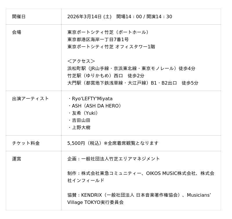 2026年3月14日(土)に東京ポートシティ竹芝にて、「SAKURA MUSIC FES.2026 ~春の音を楽しむ、アコースティックライブ~」を開催することとなりましたのでお知らせいたします。同日、竹芝エリアで開催される食や文化を楽しむイベント「第6回竹芝みなとフェスタ」のコンテンツの一つとして実施します。