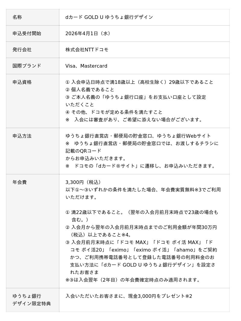 株式会社NTTドコモ(東京都千代田区、代表取締役社長 前田 義晃、以下「ドコモ」)と株式会社ゆうちょ銀行(東京都千代田区、取締役兼代表執行役社長 笠間 貴之、以下「ゆうちょ銀行」)は、全国のゆうちょ銀行直営店、郵便局の貯金窓口およびゆうちょ銀行Webサイトで、ドコモのクレジットカード「dカード GOLD U ゆうちょ銀行デザイン」の取扱いを2026年4月1日(水)から開始します。