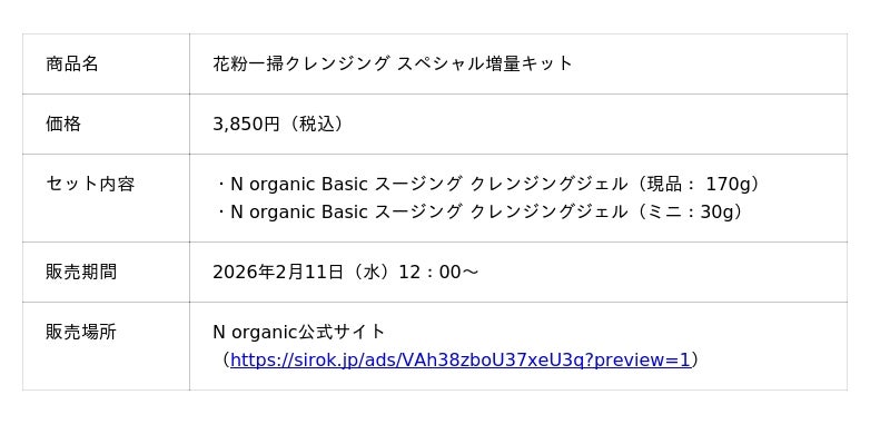 株式会社シロク(本社:東京都渋谷区、代表取締役社長:飯塚勇太)が展開する、ありのままの自分をもっと好きになることを目指すスキンケアブランド「N organic(エヌオーガニック)」は、2025年3月の発売以来ベストコスメ21冠*¹を受賞した「N organic Basic スージング クレンジングジェル」の花粉一掃スペシャル増量キットを、2026年2月11日(水)12:00より数量限定で発売いたします。