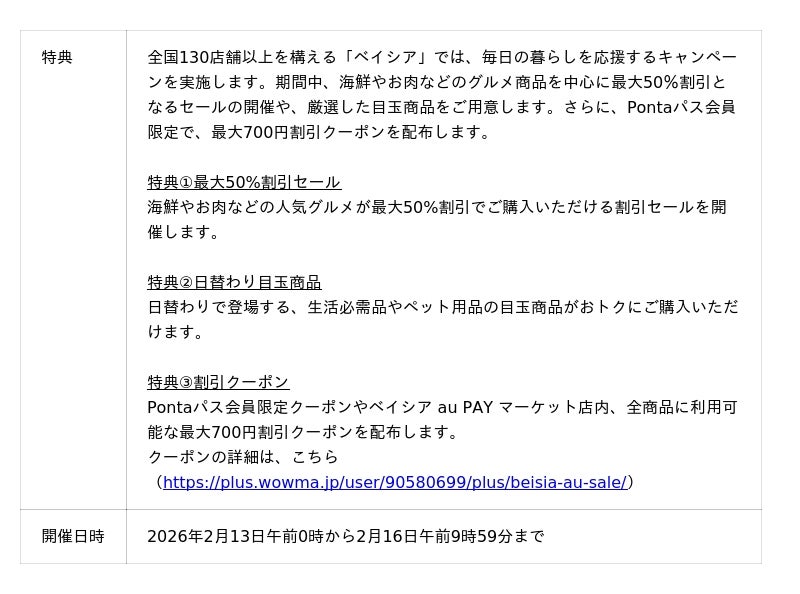 本キャンペーンでは、2店舗での購入で5%、6店舗以上の購入では16%のポイントを還元します。また、2026年2月13日は三太郎の日特典とあわせて最大50%のポイント還元に加えて、ハズレなしの特典ガチャ、50%以上割引クーポンの配布、超目玉商品セールを実施し、おトクにお買い物をお楽しみいただけます。