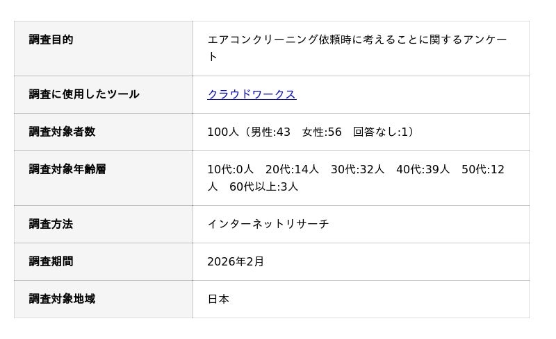 おうちにプロでは、エアコンクリーニングでお悩みの方により有益な情報を提供するために、「エアコンクリーニング依頼時に考えることに関する独自調査」を実施しました。アンケート調査の概要は以下の通りです。