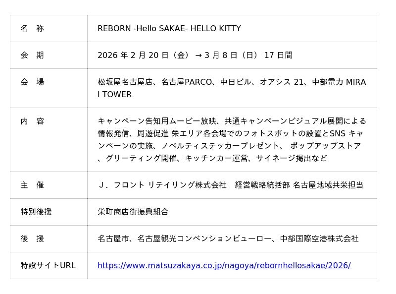 この度、J.フロント リテイリンググループ(松坂屋名古屋店、名古屋PARCO)は、中日ビル、オアシス21、中部電力MIRAI TOWERとともに、長年名古屋・栄の発展に貢献してきました栄町商店街振興組合の協力を仰ぎ、栄エリアプロモーションのさらなる強化を図ります。その一環として、施設の枠組みを超えて連携し、名古屋・栄エリアの施設を横断し、街の賑わいを創出する【REBORN -Hello SAKAE- HELLO KITTY】キャンペーンを2026年2月20日(金)から3月8日(日)までの17日間、開催します。