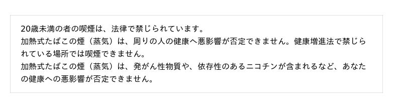 BATグループでは、たばこ製品のマーケティングを適切に実施するために国際的な自主規準を設定しています。そのため消費者に対するたばこ製品に関するすべてのコミュニケーションには、20歳未満の方へのコミュニケーションをお控えいただくとともに、「喫煙と健康に関する注意文言」を表示することを関係各位にお願いしております。加熱式たばこに関しては、記事掲載していただく際には、「健康に関する注意文言」が表示されるようご配慮いただきたく存じます。ご協力の程、何卒よろしくお願い申し上げます。