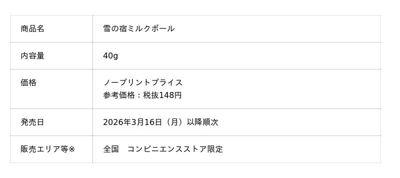 三幸製菓株式会社(本社:新潟県新潟市北区)は、ロングセラーブランド『雪の宿』から、ぽいっとひとくちサイズで手軽に食べられる「40g 雪の宿ミルクボール」を、2026年3月16日(月)より順次、全国のコンビニエンスストア限定で発売いたします。