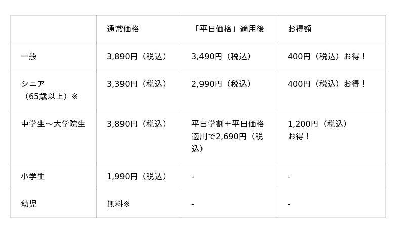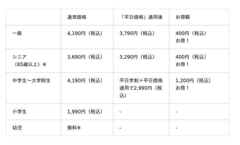 ●「平日学割」は学生証ご提示の本人に限り有効です。「平日価格」・「平日学割」はキャンペーン開催期間中の土日・祝を除く平日のみが割引適用となります。「平日価格」の対象は一般・シニア料金のお客様です。