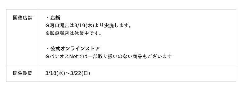![新しいレーベル登場!【パシオスが提案するアクティブスタイル】を開催[3/18(水)~3/22(日)]のメイン画像](https://prtimes.jp/img/120375/101/resize/d120375-101-669bb7d4fe105c7596aa-3.jpg)