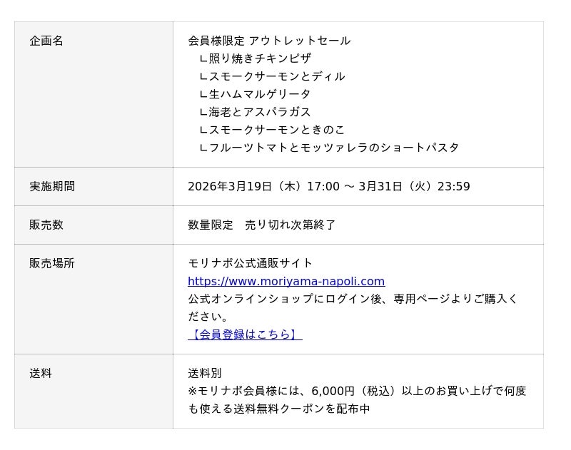 金沢発の冷凍ピザブランド「モリナポ」(製造・販売 株式会社森山ナポリ:石川県金沢市三池町)は、日頃のご愛顧に感謝を込めて、ECサイト会員様を対象とした「アウトレットセール」を2026年3月19日(木)から3月31日(火)まで、期間限定で開催いたします。