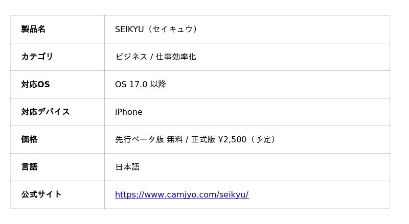 アウトドアコンサルタントとして日本全国のキャンプ場づくりを手がけるキャンプ女子株式会社(代表:柴垣)は、フリーランス・個人事業主・ノマドワーカー向けの iOS 向け請求書&見積書作成アプリ 『SEIKYU(セイキュウ)』 の先行ベータ版事前登録受付を本日開始いたしました。買い切り¥2,500・完全オフライン設計で、月額課金なし。インボイス制度にも完全対応し、iPhone ひとつでプロフェッショナルな請求書を作成・共有できます。