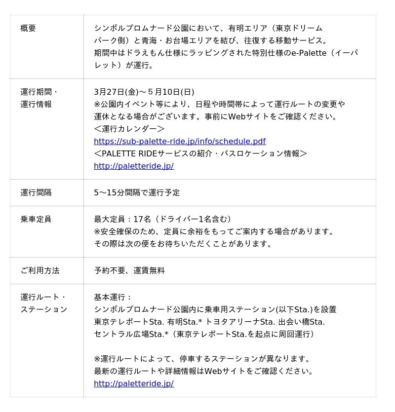 「100%ドラえもん&フレンズ in 東京」に合わせ、ドラえもん仕様にラッピングした「PALETTE RIDE」を有明エリアと青海・お台場エリアを結ぶシンボルプロムナード公園で運行します。
